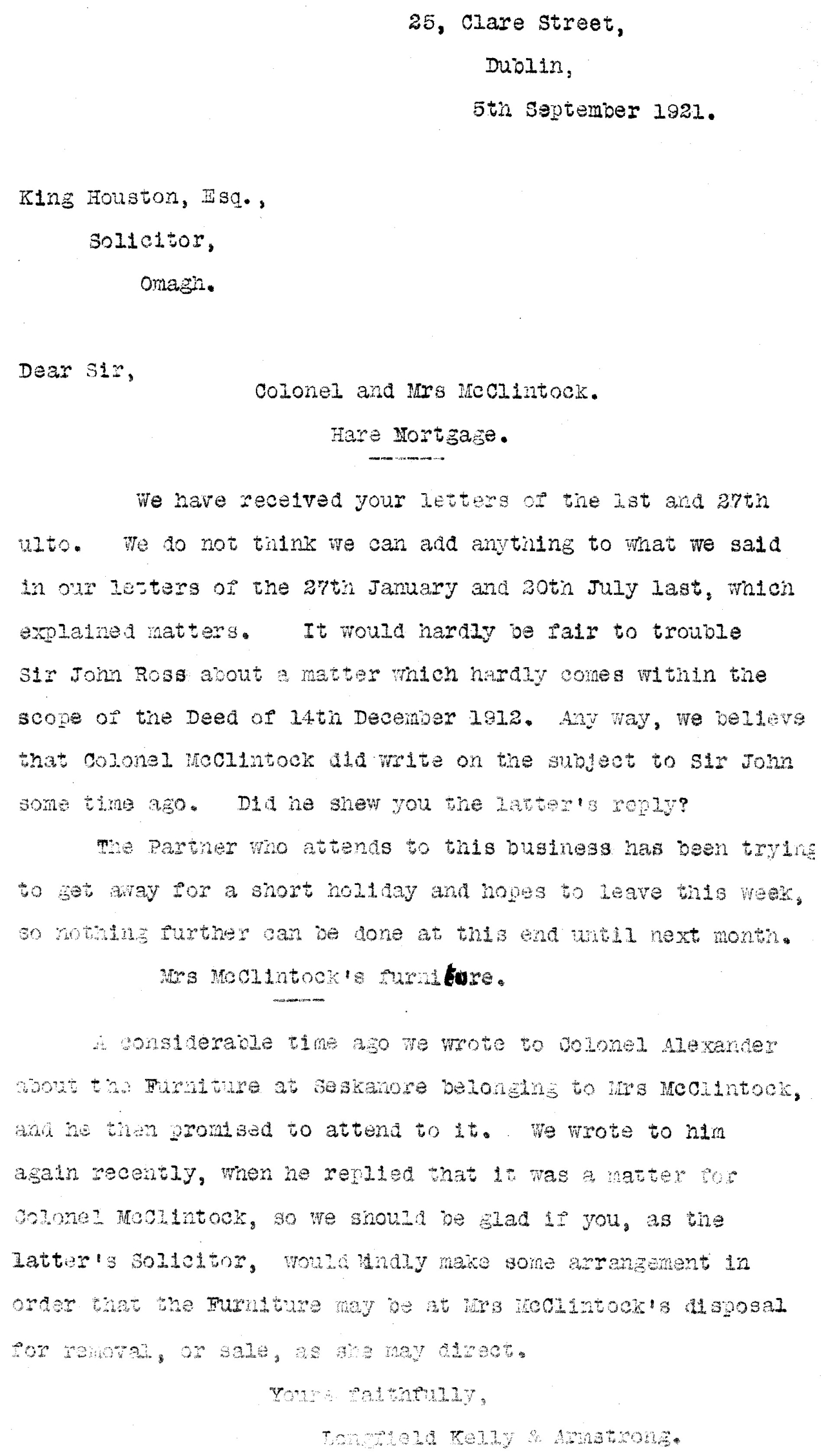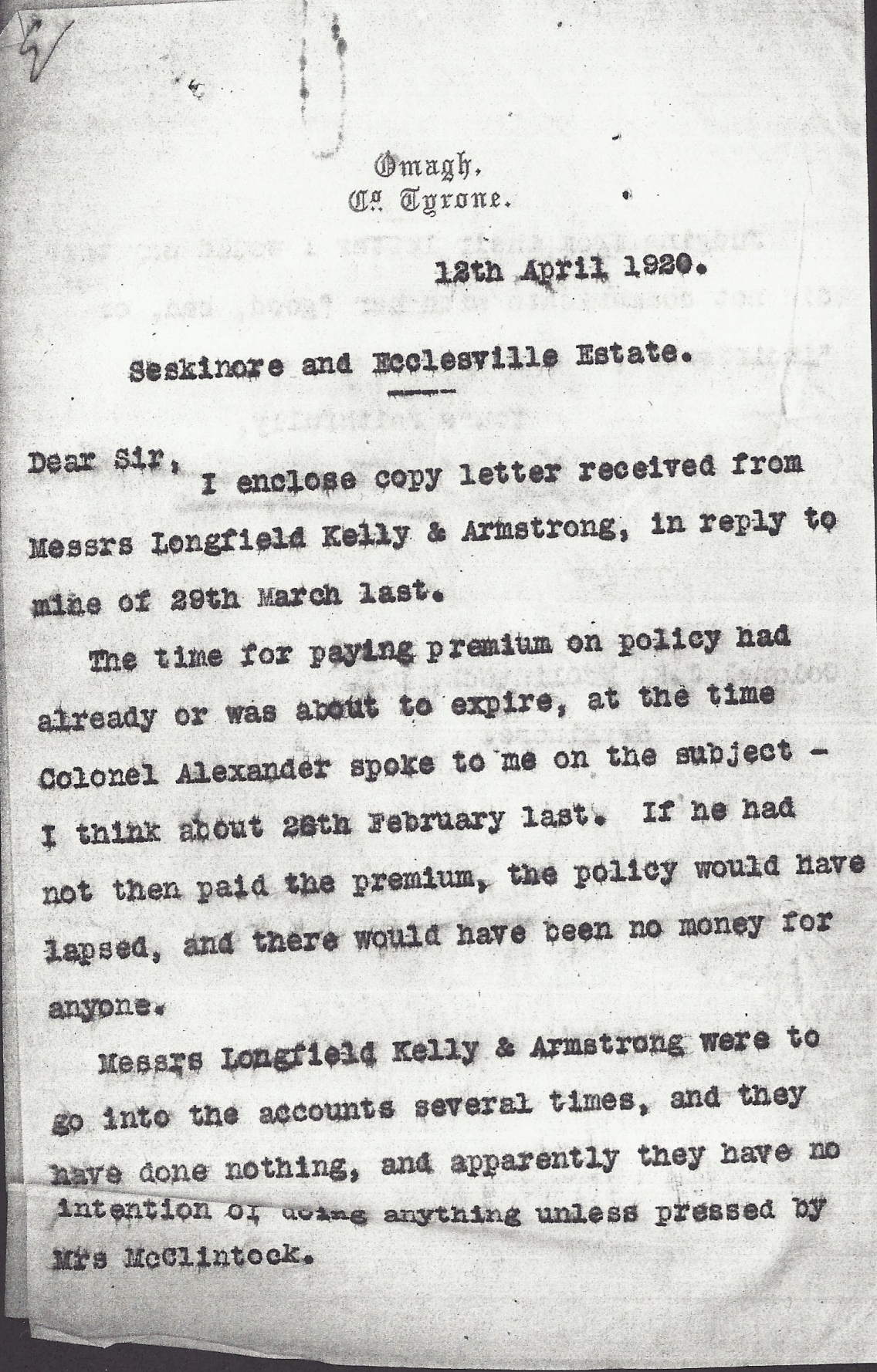 I handed over everything I had gathered: documents, title deeds, correspondence. I also informed the land agent in Belfast that I would no longer be the point of contact. Going forward, Mrs Lewis would manage the property.