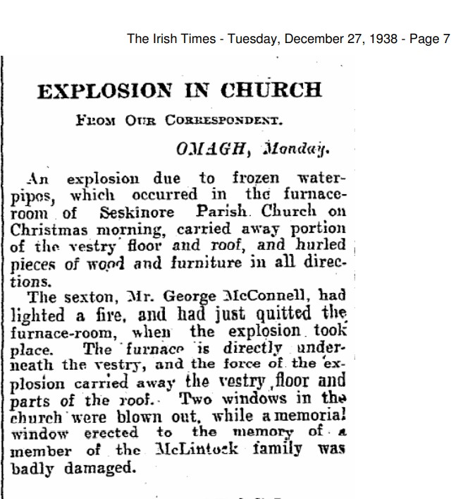 Later, the Tyrone Constitution (1845) reports the arrival of Samuel McClintock at Seskanore, stating that the property had passed to him from his uncle, George Perry. Notably, no mention is made of Alexander McClintock of Drumcar, further reinforcing the conclusion that the inheritance came directly through the Perry line.
