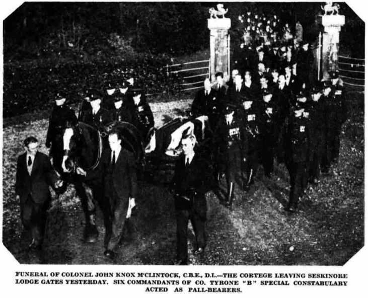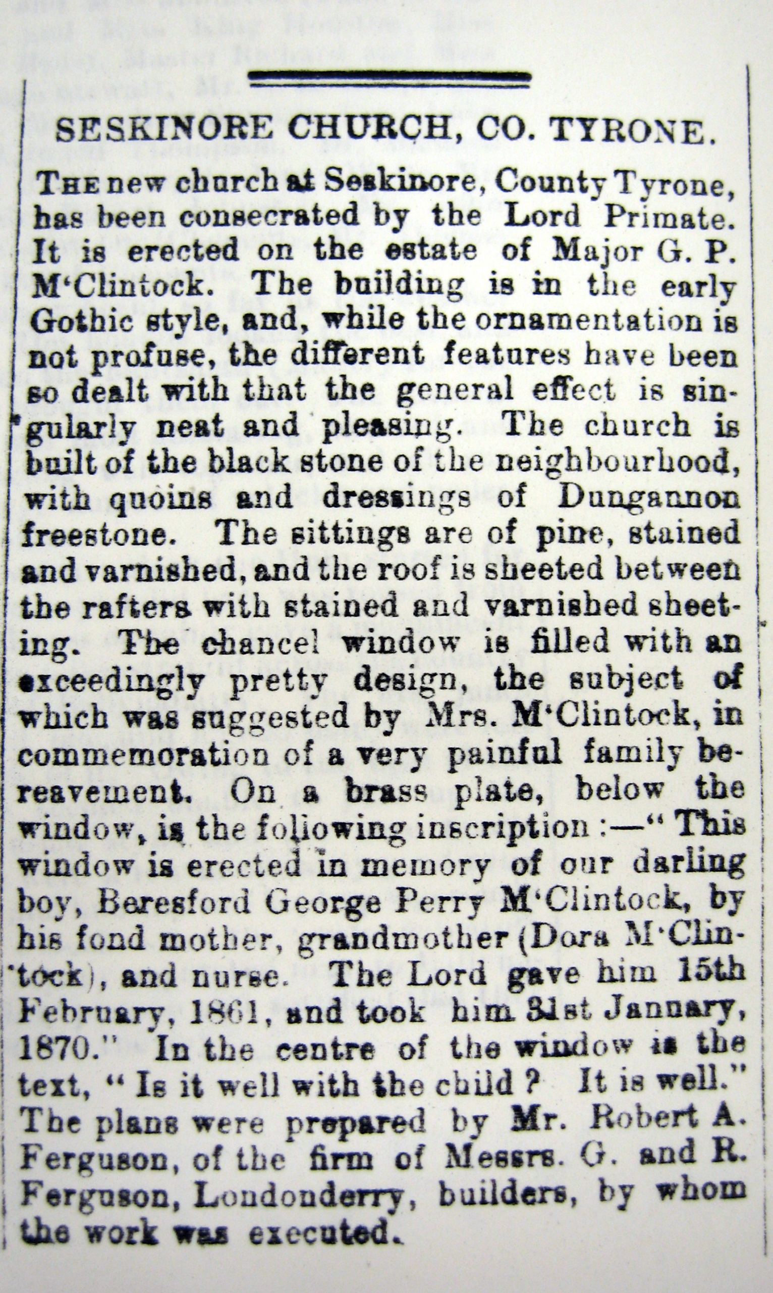 'The old and picturesque McClintock mansion of Seskinore lies in the Parish of Clogherny (Cloichearnach, an offshoot of Clocher, Cloharach, or Cloithreach, meaning a stony place, and anglicised (Clogherny), near the village of Seskinore (called in a Map of the Plantation, Shaskanoure, 'pointing clearly,' says Joyce, 'Sescennodhar—ie, Grey Marsh,' about six miles south-east of Omagh, in the historic barony of that name.'