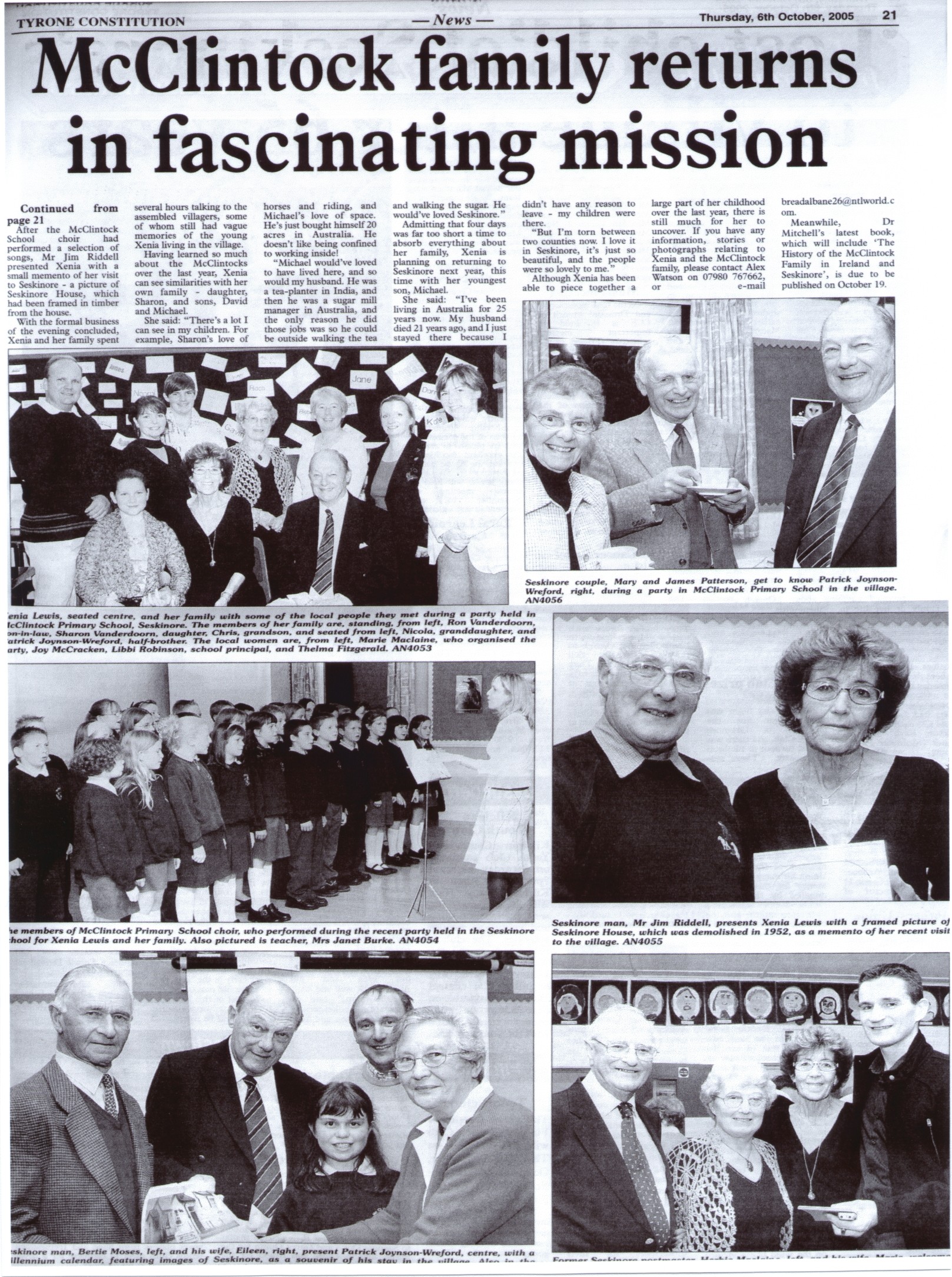 In September 2005, Xenia travelled from Australia with her daughter Sharon, son-in-law Ron, and grandchildren Christopher and Nicky. They stayed with my mum and dad, who had more space to host the family, while Xenia stayed with Peter and me. We spent our evenings sharing meals and our days exploring local sights. Among the highlights of their visit was our long-anticipated trip to Seskinore—the ancestral home that Xenia had left behind as a child.